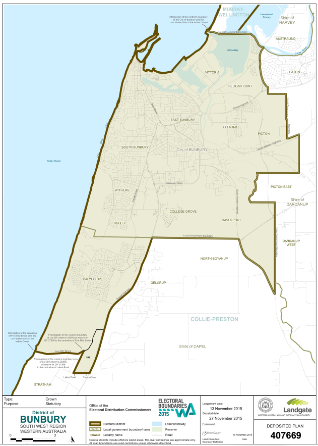 Comprising of all or parts of the localities of Bunbury, Carey Park, College Grove, Dalyellup, Davenport, East Bunbury, Glen Iris, Pelican Point, Picton, South Bunbury, Usher, Vittoria, and Withers.